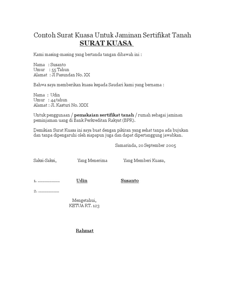 7 Contoh Surat Kuasa Tanah Untuk Berbagai Kepentingan di ... from cdn.shortpixel.ai Pinjaman dengan jaminan sertifikat tanah adalah jenis pinjaman yang sangat banyak diajukan oleh masyarakat saat ini. Halo bank mega syariah pinjaman lunas jaminan masih ditahan. Untuk dan atas nama pemberi kuasa untuk mengambil sertifikat rumah yang beralamat jalan sukomulio, gang nusa satu, no. Jika kita memiliki harta benda, maka sangat penting bagi kita untuk menjaga dan merawat harta tersebut, seperti harta tanah contohnya. Contoh surat kuasa tanah untuk jaminan bank dalam melakukan pinjaman ke bank seperti bank mandiri tentu harus ada agunan yang diberikan. .kuasa pengambilan sertifikat yang bisa digunakan untuk pengambilan sertifikat tanah atau rumah baik itu di bank karena sebagai jaminan pinjaman yang demikian surat kuasa ini dibuat untuk dipergunakan sebagaimana mestinya. Nah bagaimana tepatnya surat kuasa jaminan sertifikat tanah ini. Kemudian, jangan lupa juga pahami beberapa hal berikut saat membuat surat kuasa yang dimaksud.